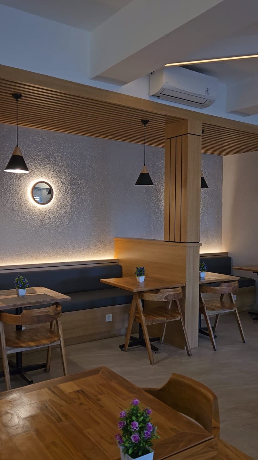 A Scandinavian themed interior for a well known restaurant in the Jimbaran area. The work includes the creation of a fixed sofa, wood ceiling, partitions, and the installation of LED strip lighting.
