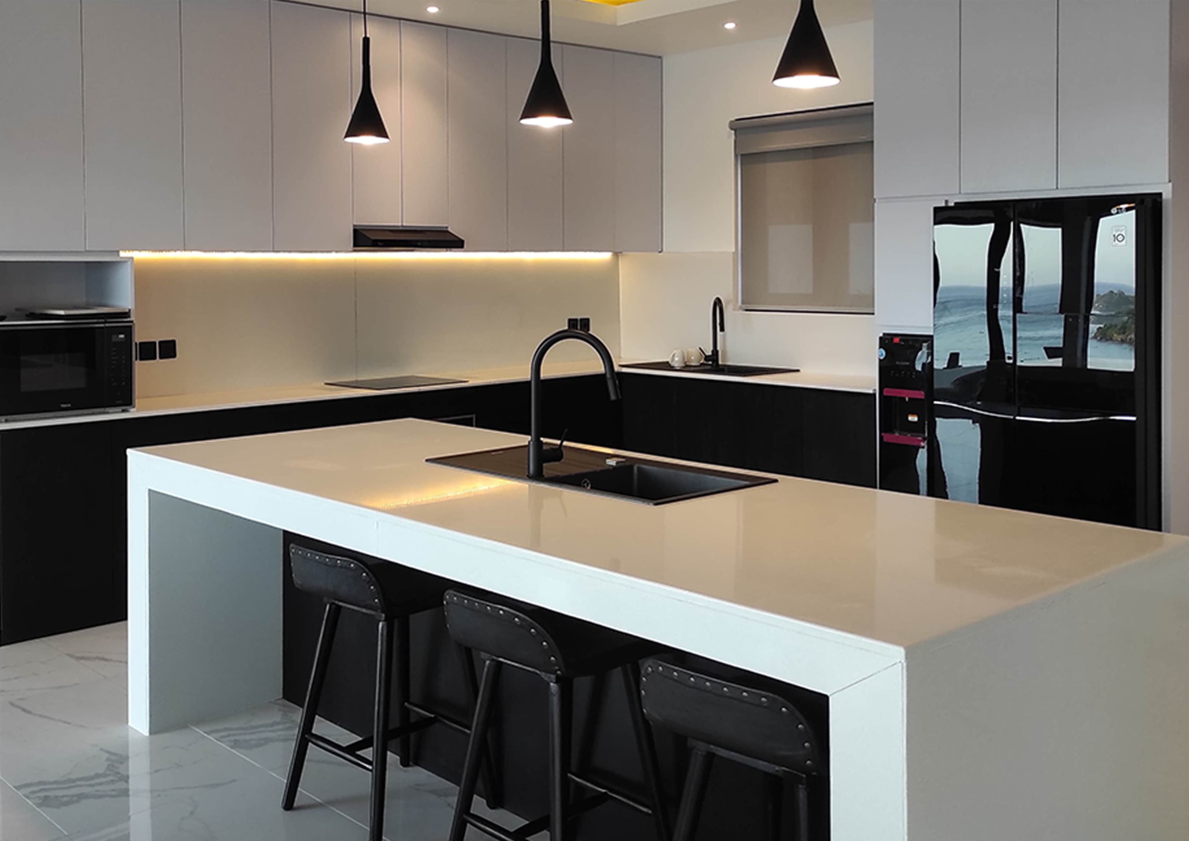 The kitchen set and island are designed with a Monochrome Minimalist concept, per the owner's request for a kitchen area that is simple yet elegant. By optimizing the spacious area and ample lighting with plenty of open space, this design harmonizes seamlessly with the overall concept of the building.